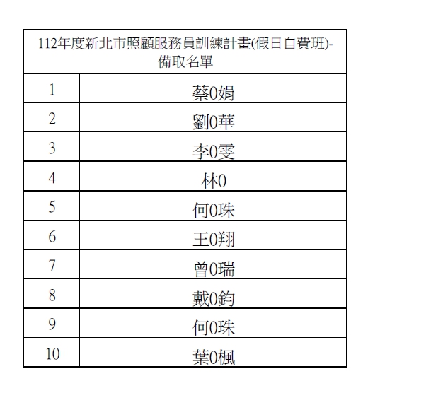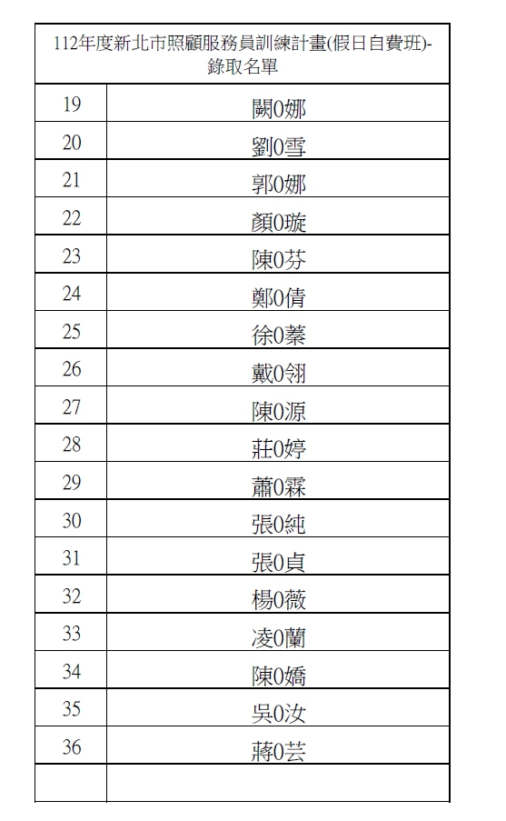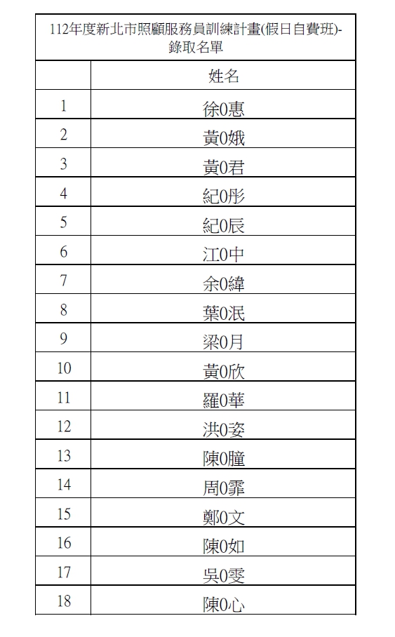 112年度新北市照顧服務員專班第32期自費班-錄訓名單