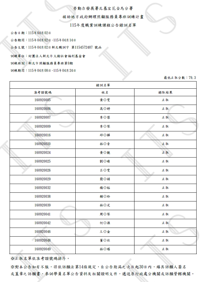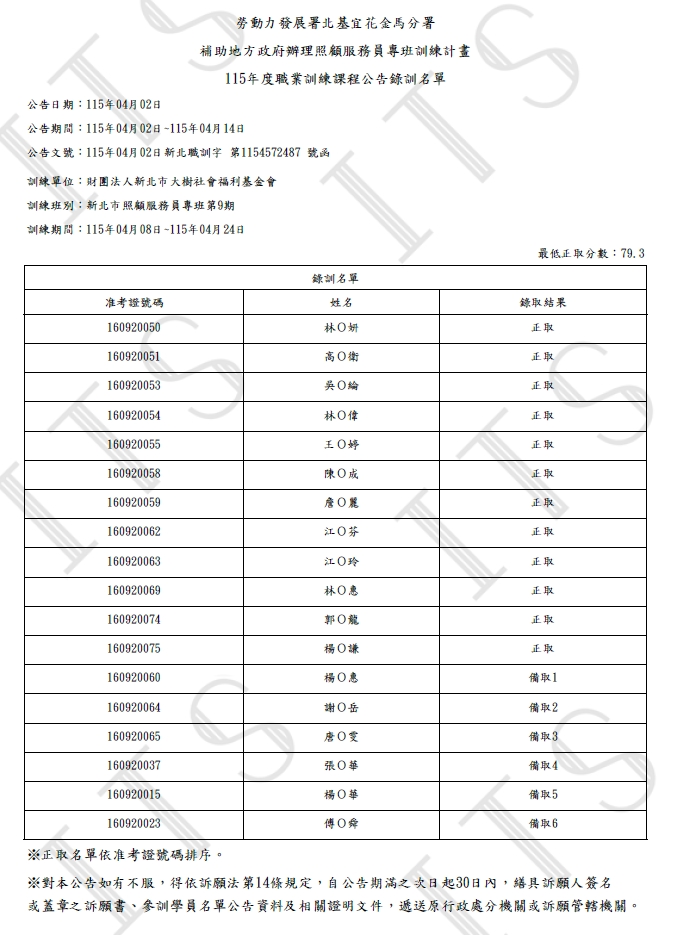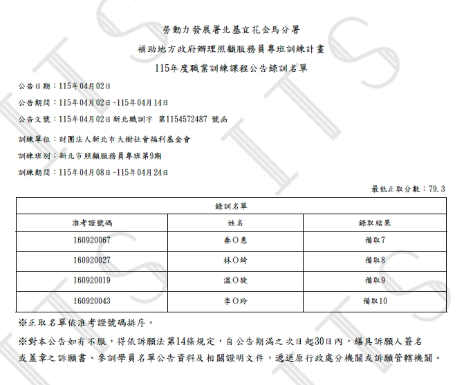 115年度新北市照顧服務員專班第9期(補助班)-錄訓名單